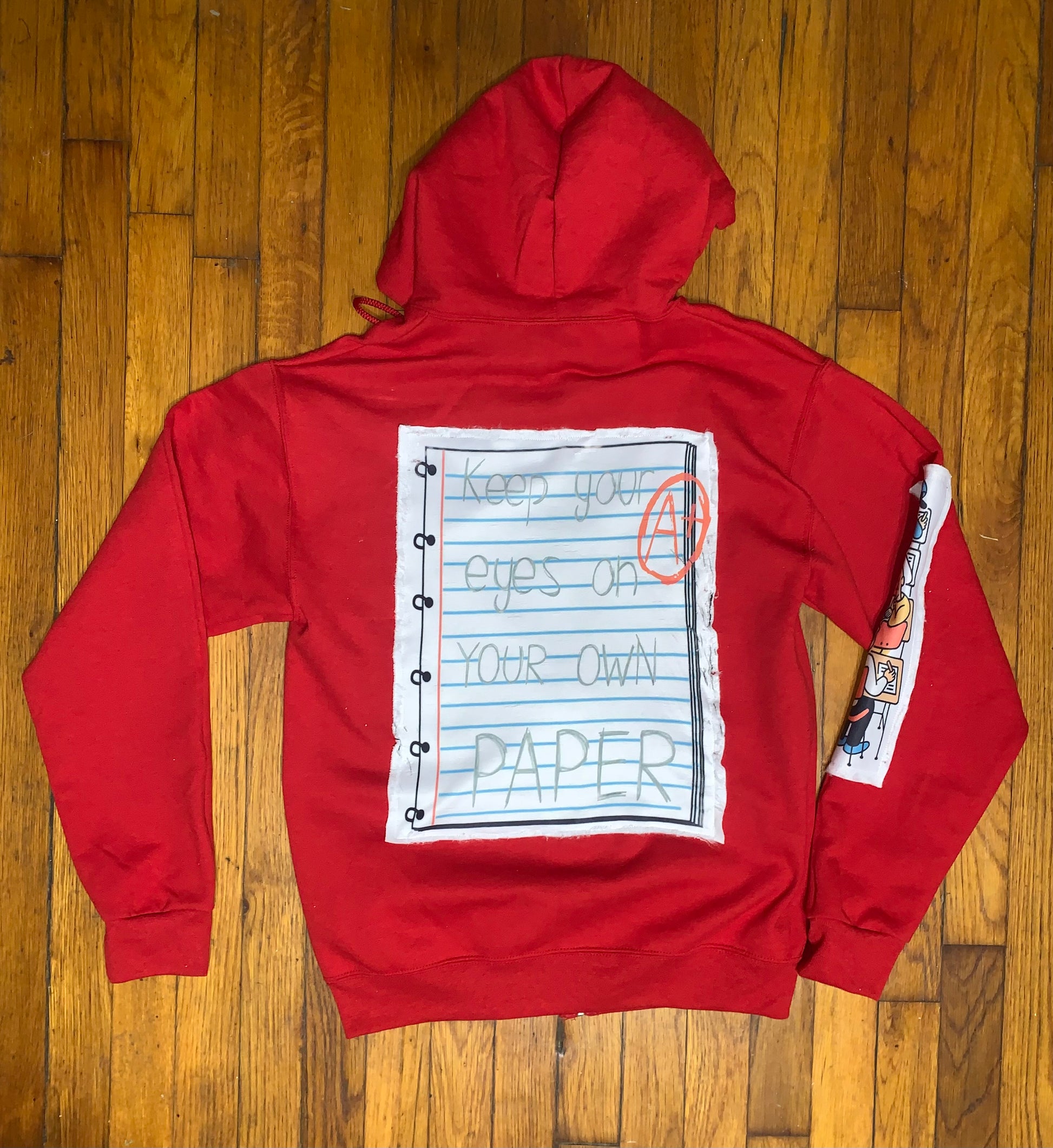Red 100% cotton zip up hoodie featuring raw edge patches on front,back & sleeve(Hoodie fits true to size)